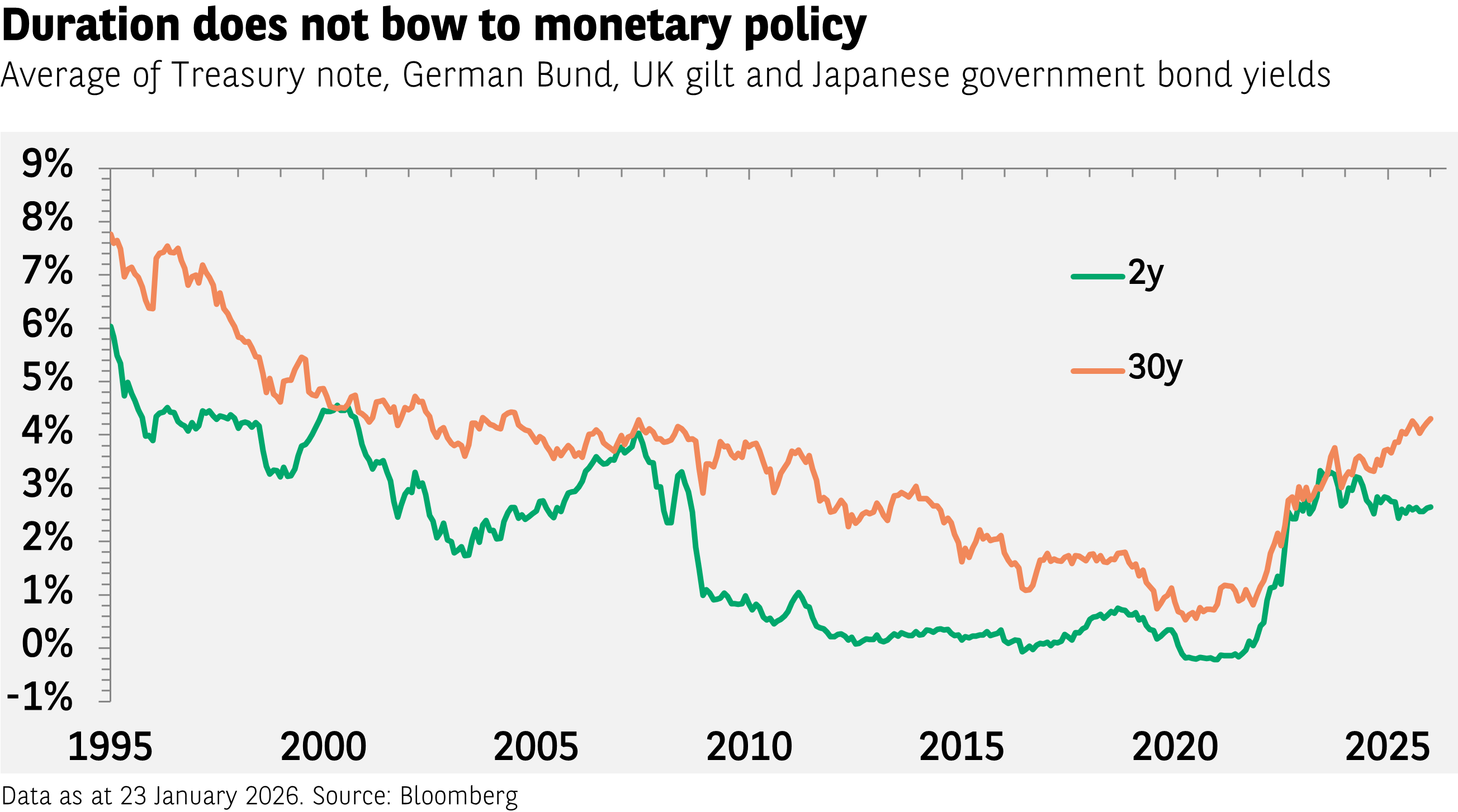 According to the general consensus, investors appear to have quite a bullish outlook, and this is reflected in portfolio allocations. While geopolitical uncertainty has picked up again since the start of 2026, investors seem convinced that the global economy will prove resilient in the face of unpredictable shocks and that monetary policy will do whatever is needed to buffer any short-term deterioration in financial conditions. However, while central banks have cut interest rates over the past 12 months, long-dated bond yields have increased, notably in Japan, highlighting investor concerns over long-term government debt.