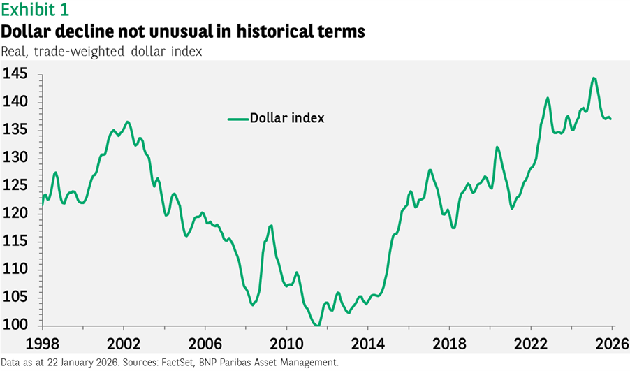 Another asset that could see a more meaningful price impact is the US dollar as foreign investors sour on the appeal of US assets (the so-called “sell America” trade). While this is certainly a factor for some, it is not clear that the dollar has moved much because of it. The greenback lost just $0.01 of value versus the euro over the last few days. In 2025, it fell 5% in real, trade-weighted terms, but this followed a nearly 50% appreciation since 2011 and is less than the 9% decline seen during the first Trump administration (see Exhibit 1).