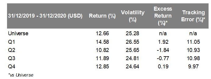 In a volatile year impacted by the global coronavirus pandemic, the AXA IM Exclusion policies added 3.71 ppt to the benchmark return and did not negatively impact the returns of the opportunity set which has been proxied by the MSCI ACWI. Higher-ranked names in terms of ESG outperformed both the universe and the lower ranked names.